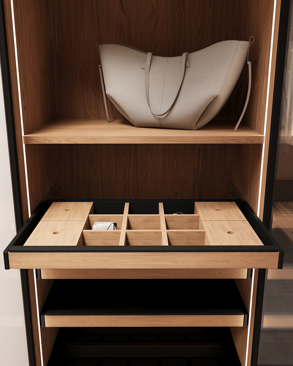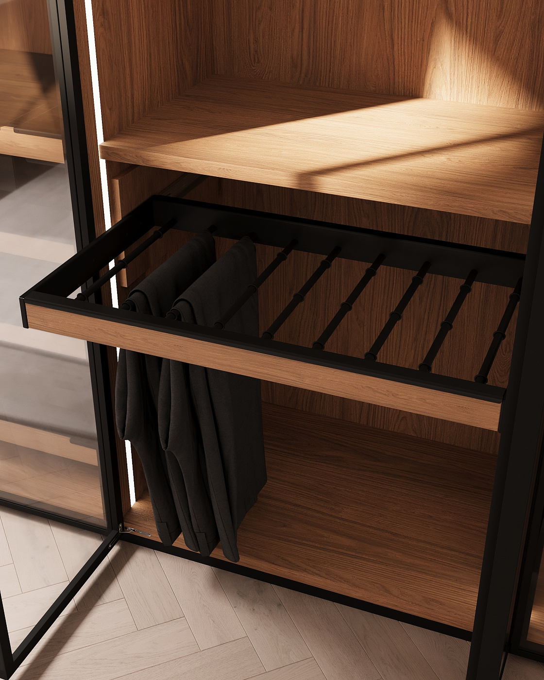 Гардеробная Black and White имеет отличительные особенности — ящики из металла, придающие конструкции индустриальный акцент и надёжность. Контраст мягкой текстуры декоративной планки из ясеня и холодной строгости металла делает дизайн выразительным и современным.