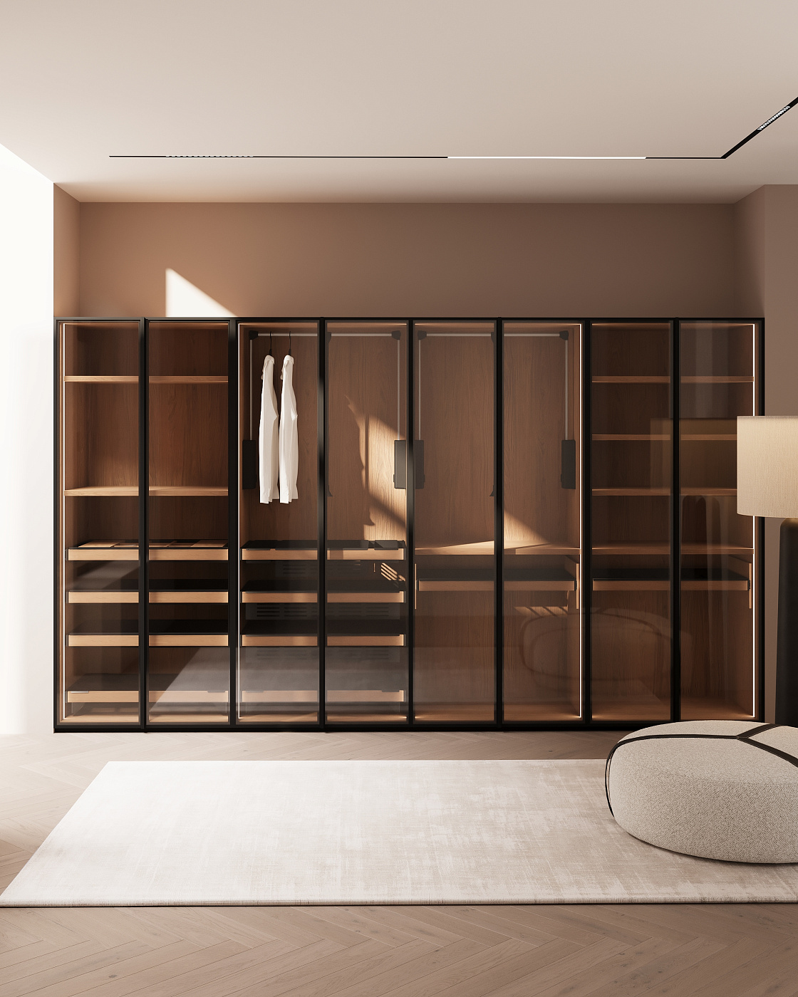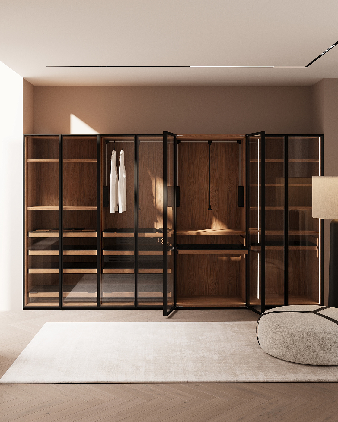 По желанию гардеробная может быть дополнена встроенной подсветкой, которая не только создаёт комфортную атмосферу, но и делает использование системы хранения ещё более удобным.