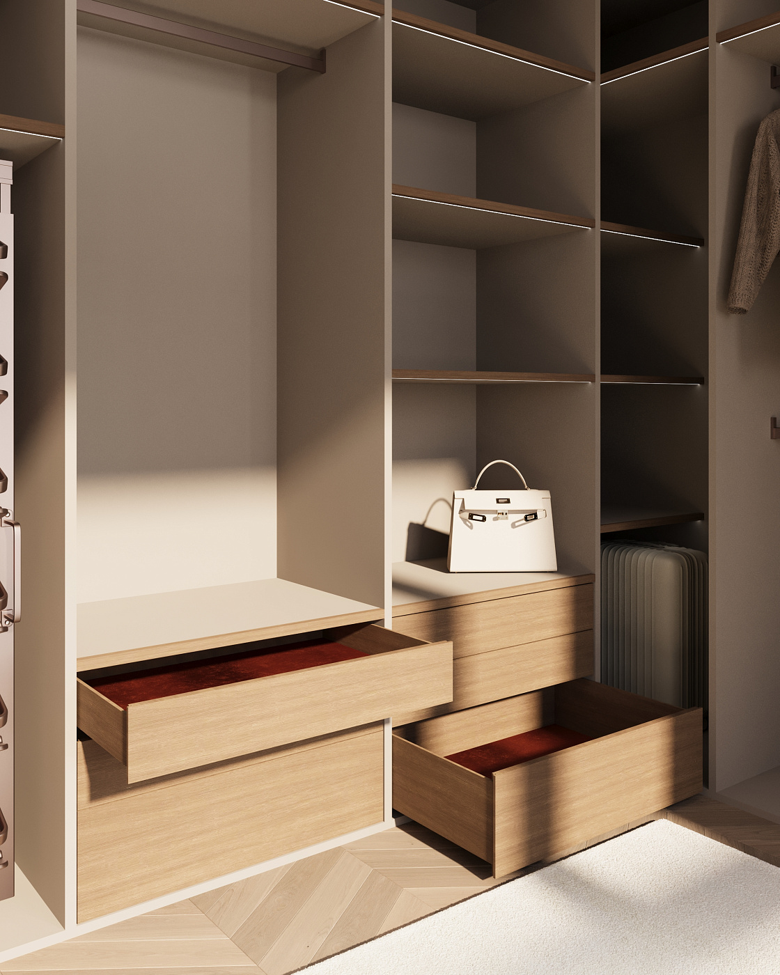 Особое внимание мы уделили ящикам — они изготавливаются на нашем производстве, что позволяет тщательно контролировать качество, подбирать идеальные сочетания материалов и создавать продуманные детали, подчеркивающие индивидуальность коллекции.