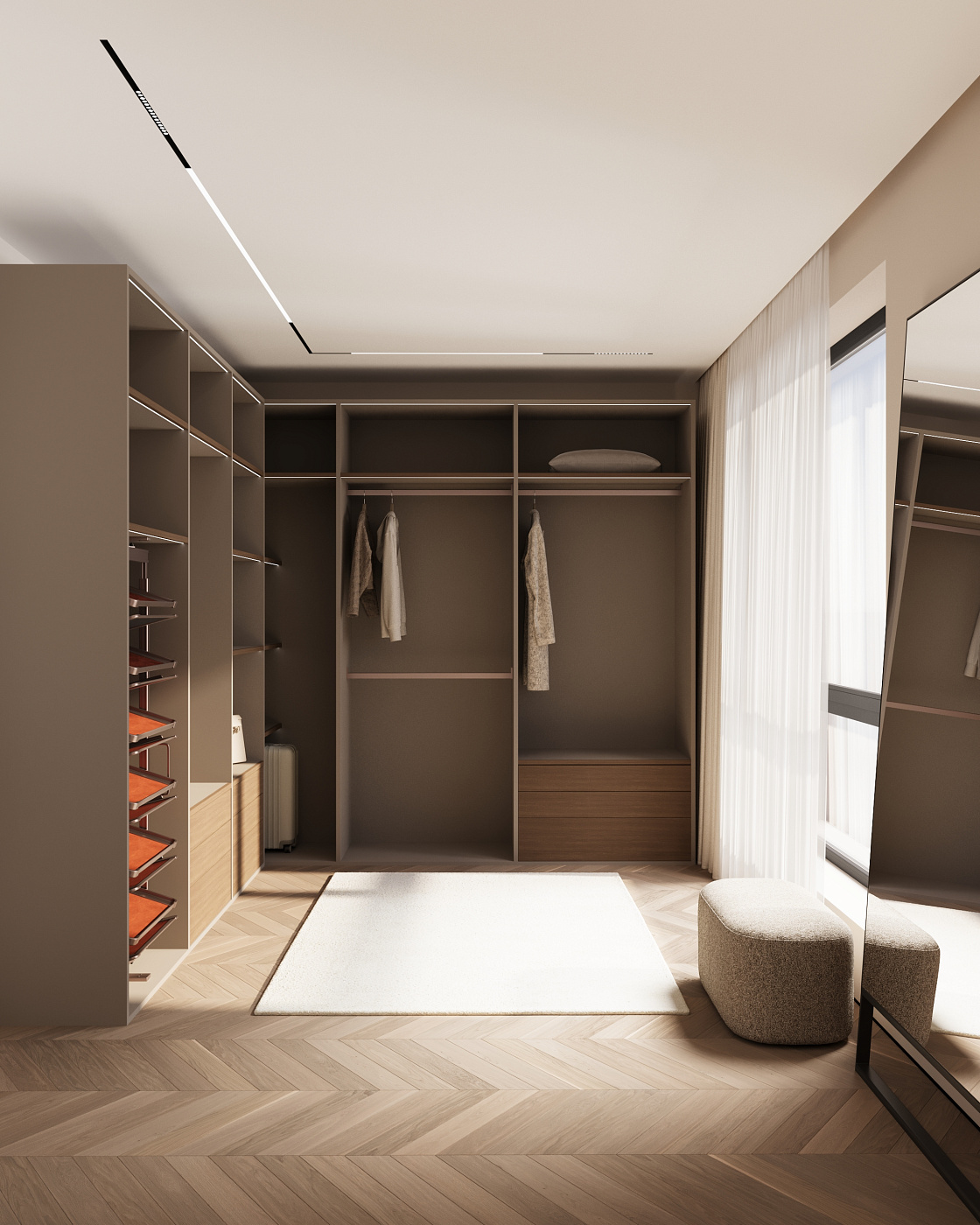 В конструкции используется фурнитура премиум-класса Hettich и Макмарт, обеспечивающая надежность и долговечность гардеробной. Возможна установка встроенной подсветки для дополнительного комфорта и эргономики пространства.