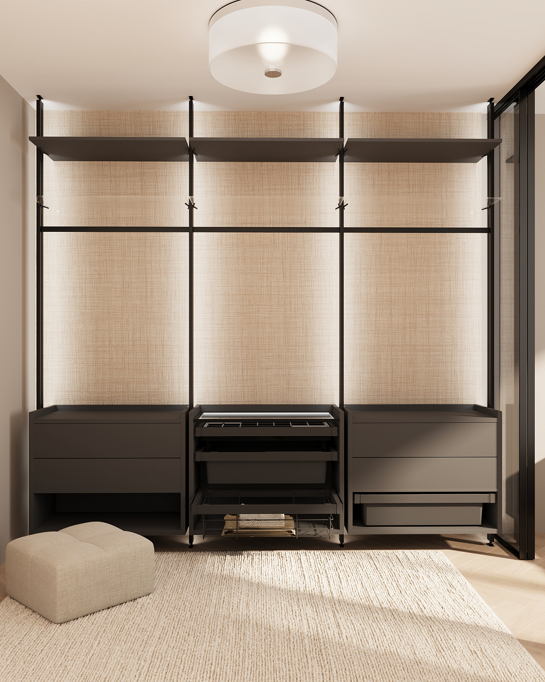 Вы сами выбираете конфигурацию: ящики, полки, штанги для одежды — система легко адаптируется под задачи, пространство и образ жизни.