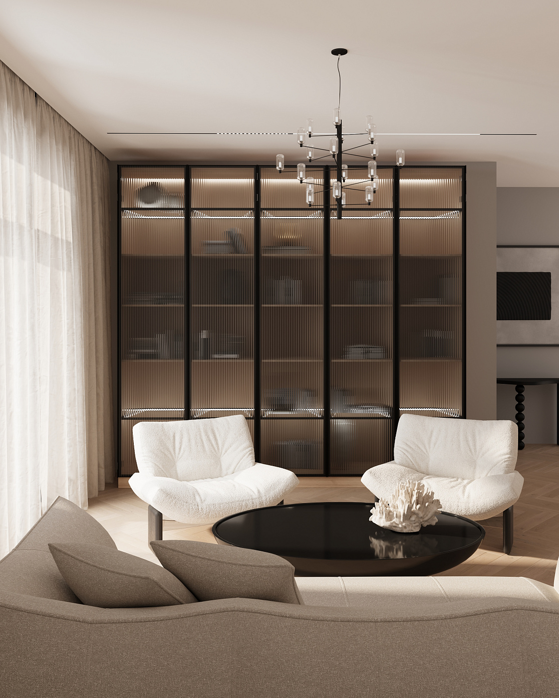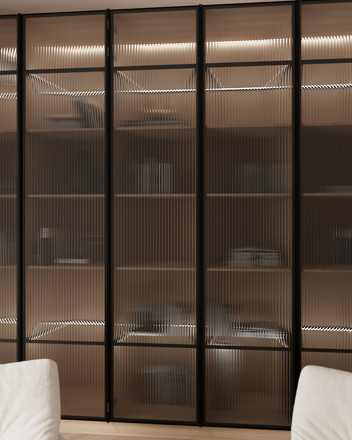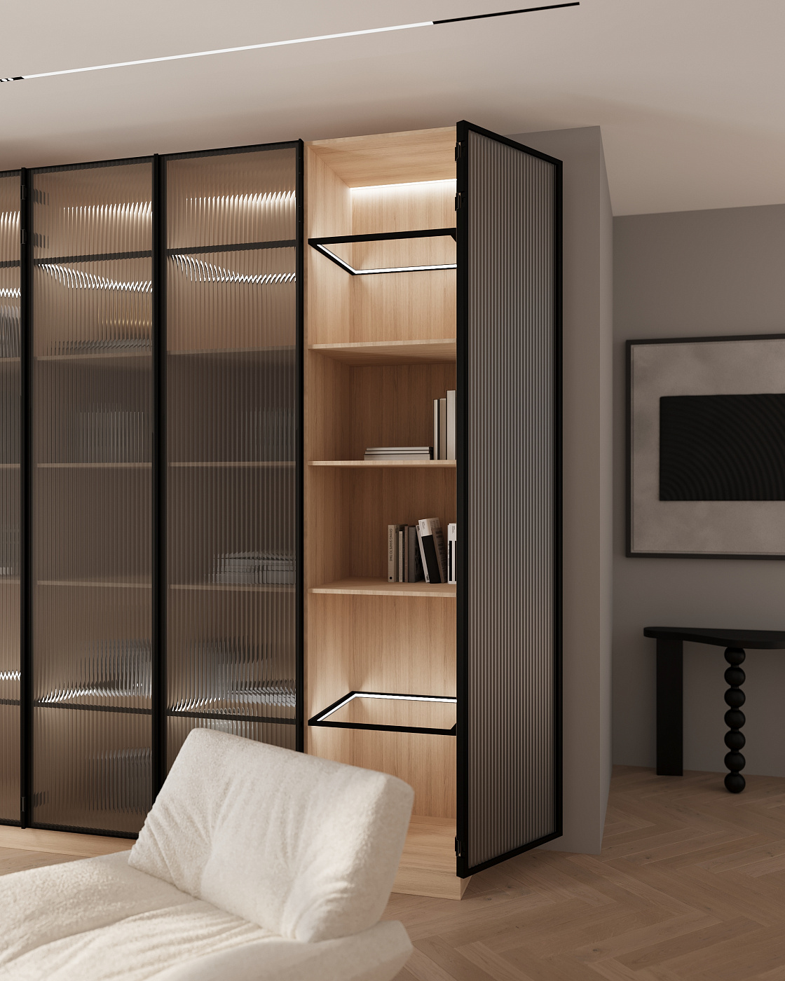 Фасады в алюминиевой рамке с торцевыми петлями Neapol — это гармония изысканного дизайна и инженерной точности. Преимущества фасадов с петлями Neapol: Угол открывания 270° — полный доступ к внутреннему пространству шкафов без ограничений. Надежность для тяжелых дверей — петли выдерживают фасады высотой до 3000 мм , шириной до 600 мм и весом до 40 кг. Плавное закрывание — встроенные доводчики обеспечивают мягкое и бесшумное движение даже при больших нагрузках. Идеальная подгонка — регулировка в трех плоскостях для точной настройки и безупречного внешнего вида. Чистота линий — скрытый механизм подчеркивает эстетику минимализма, оставляя дизайн лаконичным и современным. Такое решение особенно актуально для премиальных гостиных, где важна каждая деталь. Торцевые петли Neapol не только функциональны, но и эстетически совершенны: ничего лишнего, только комфорт, надежность и стиль.