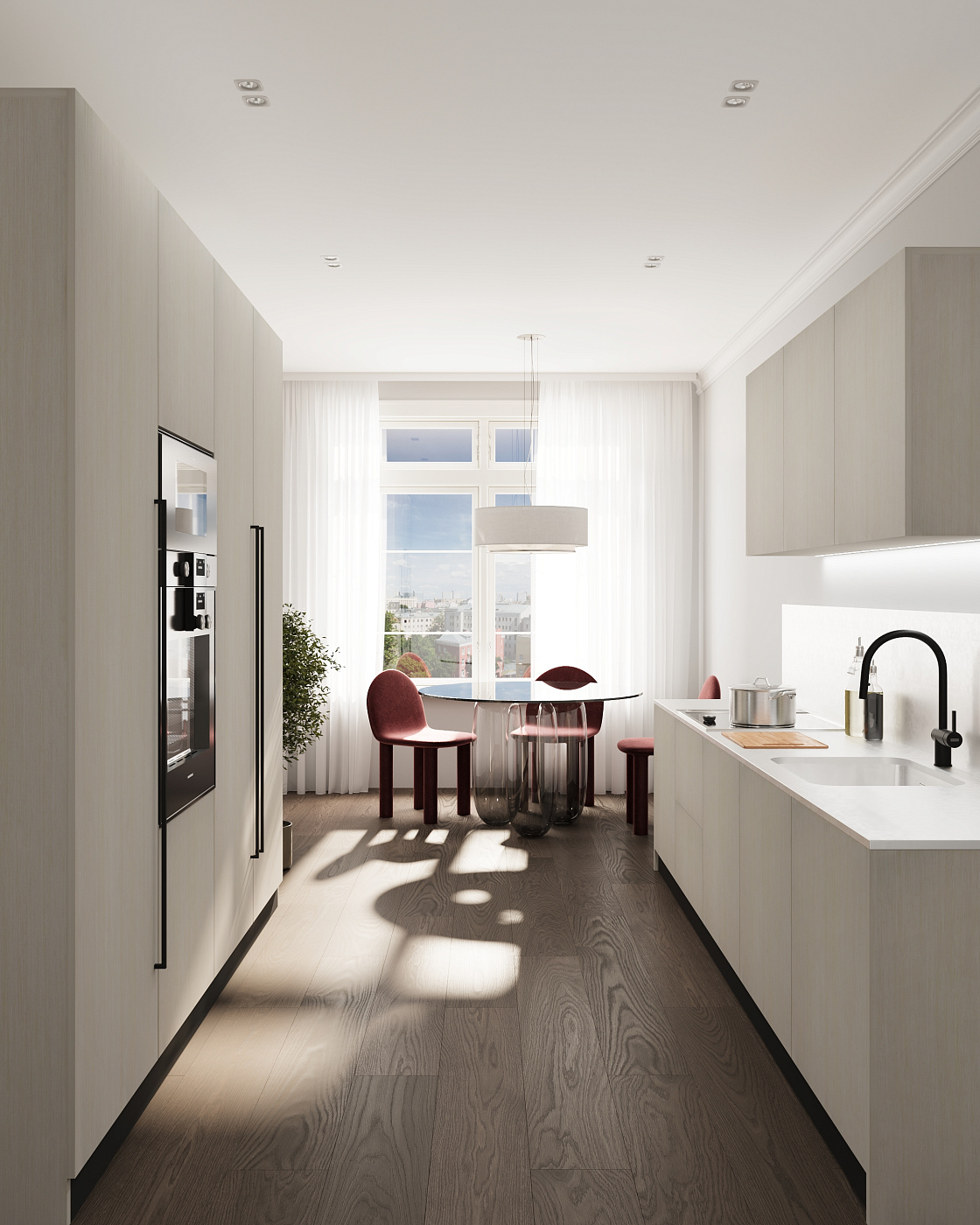Такая кухня легко впишется в интерьер в скандинавском, современном или минималистичном стиле и станет гармоничным продолжением архитектуры пространства.