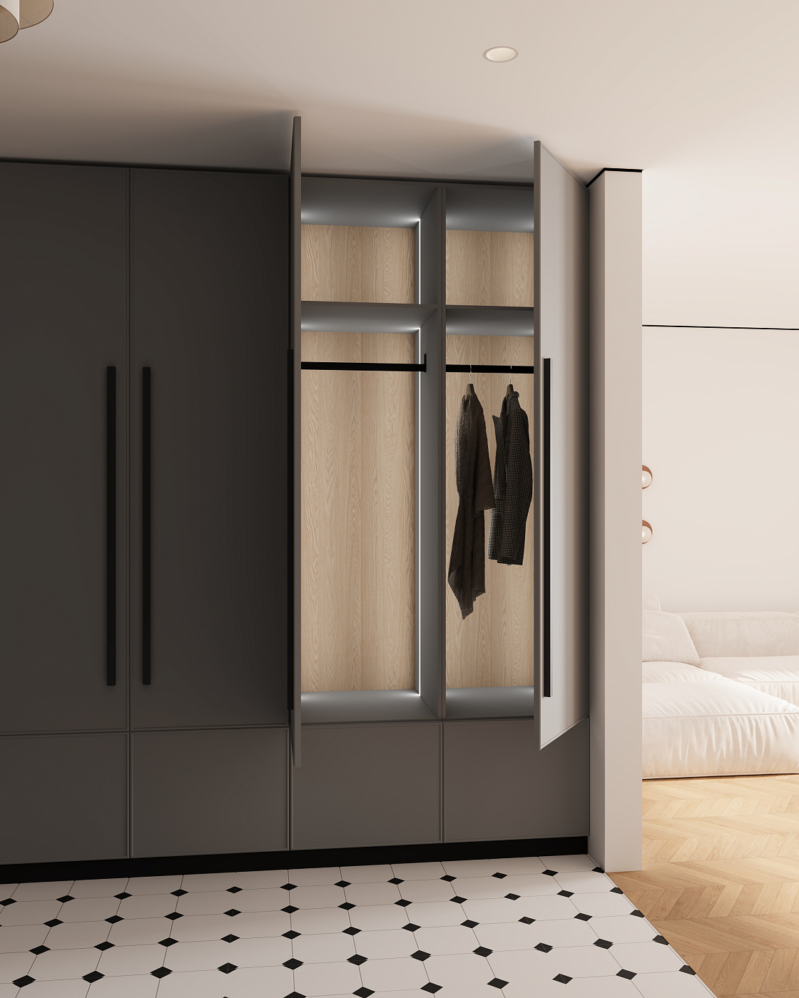Что касается корпусной мебели, здесь потребовалась командная работа - менеджер, конструктор, сборщик, руководитель. Да, не все шло так гладко как хотелось, но за многие годы практики скажу, что с корпусной мебелью почти всегда с первого раза не получается все идеально и у других производителей, особенно когда заказ большой и комплектуется вся квартира.