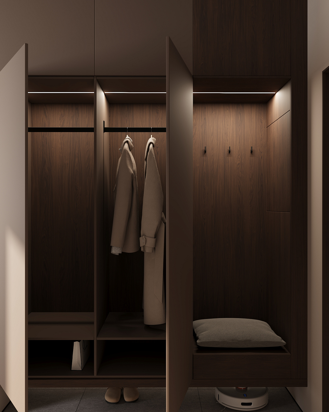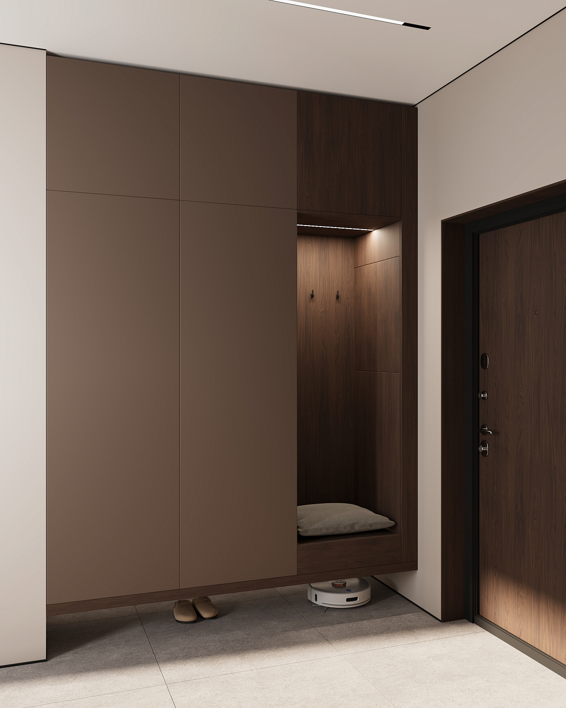 Мы подбираем индивидуальный оттенок по палитре NCS или RAL — точно под интерьер. Прихожая в матовой эмали может быть акцентной или, наоборот, визуально «растворённой» в пространстве, если вы предпочитаете спокойную нейтральную палитру.