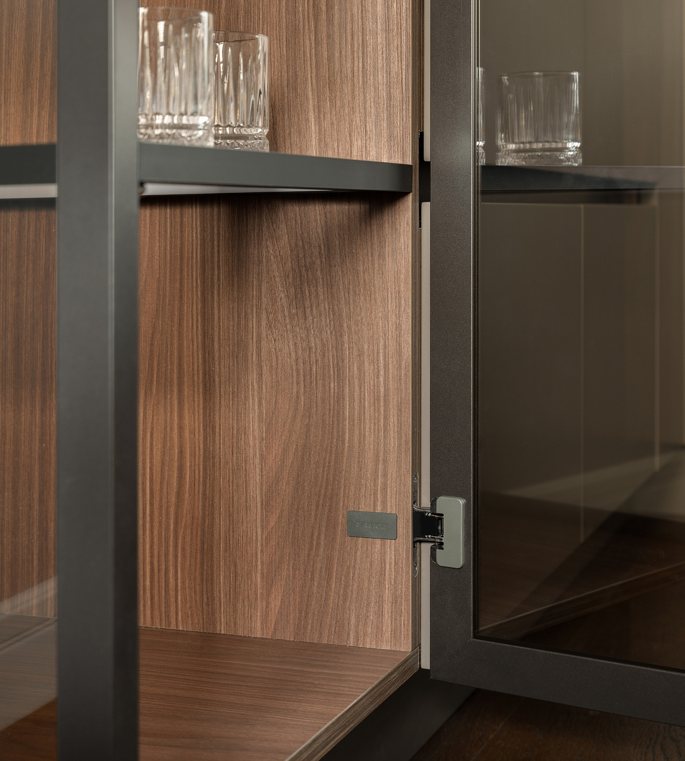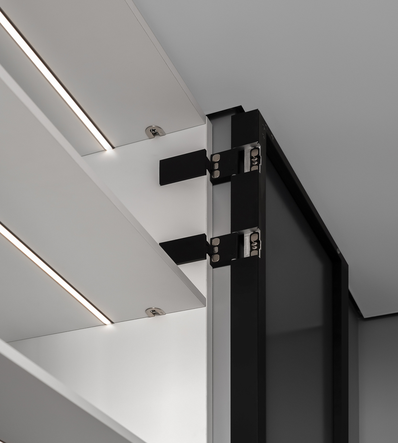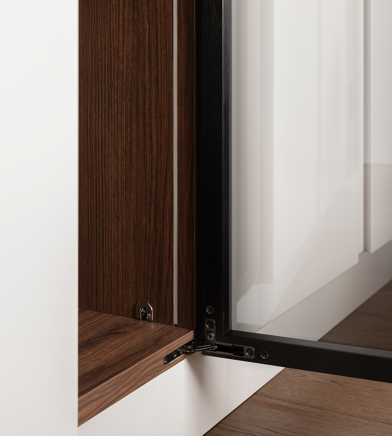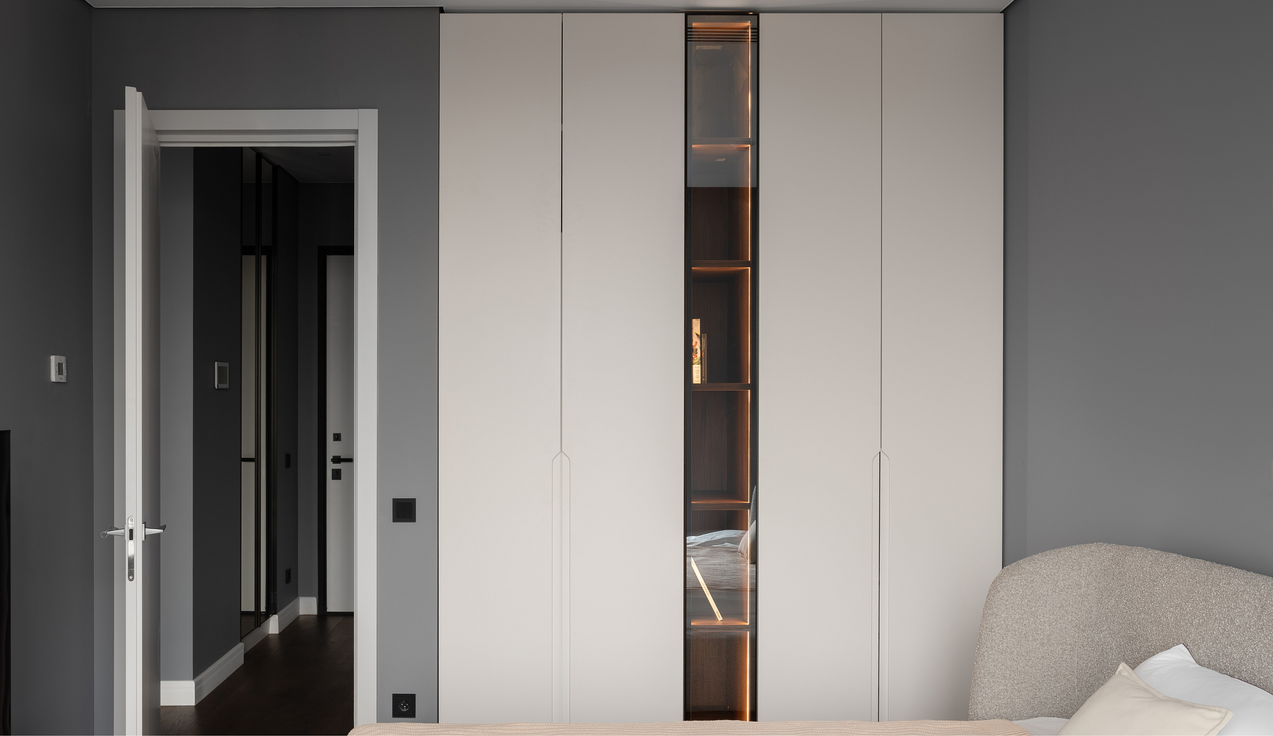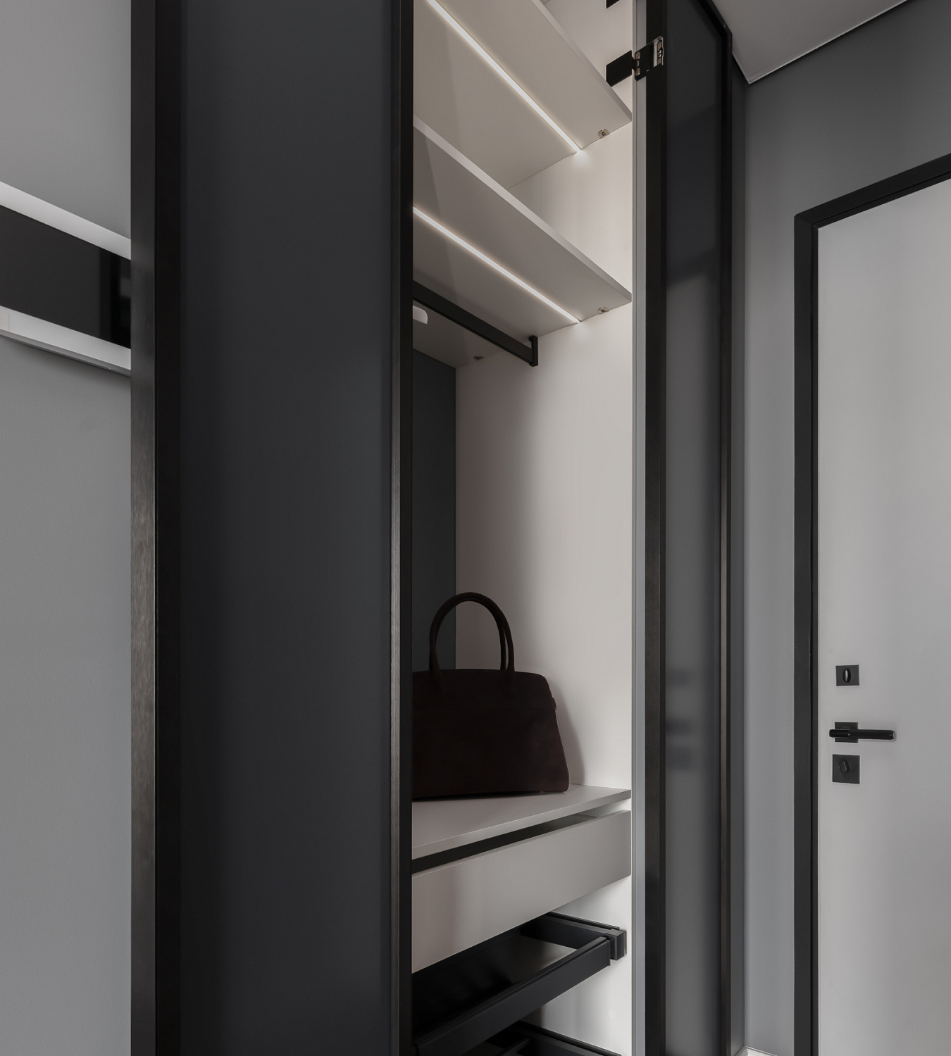 Также в зоне прихожей был реализован шкаф с фасадами в алюминиевой рамке и зеркалами с внешней стороны, оснащённый петлями Neapol с углом открывания 270°. Двери полностью распахиваются, не перекрывая проход и сохраняя комфорт даже в небольшой входной зоне.