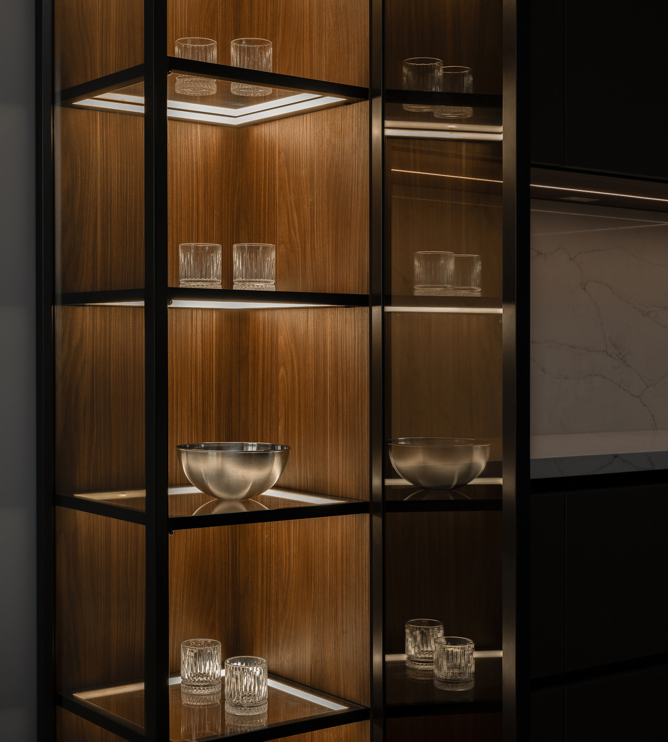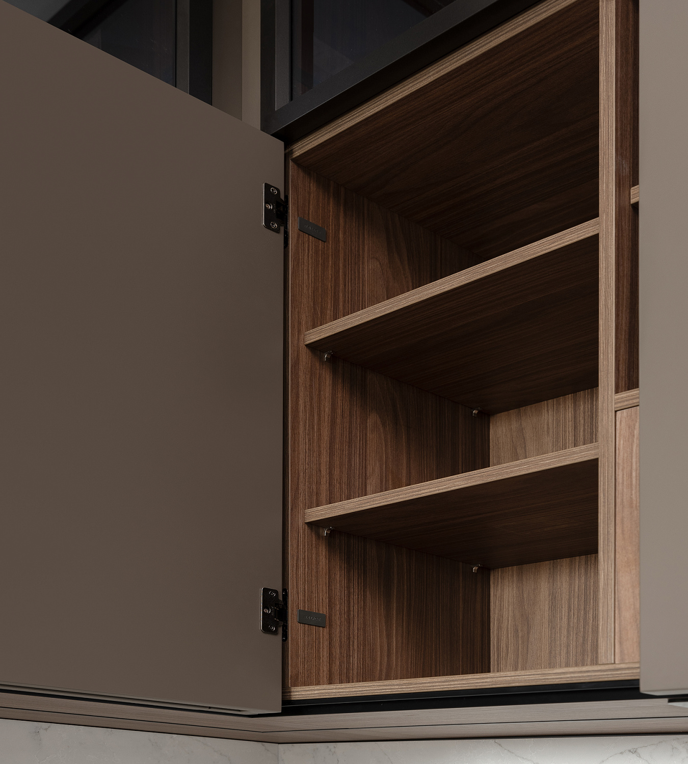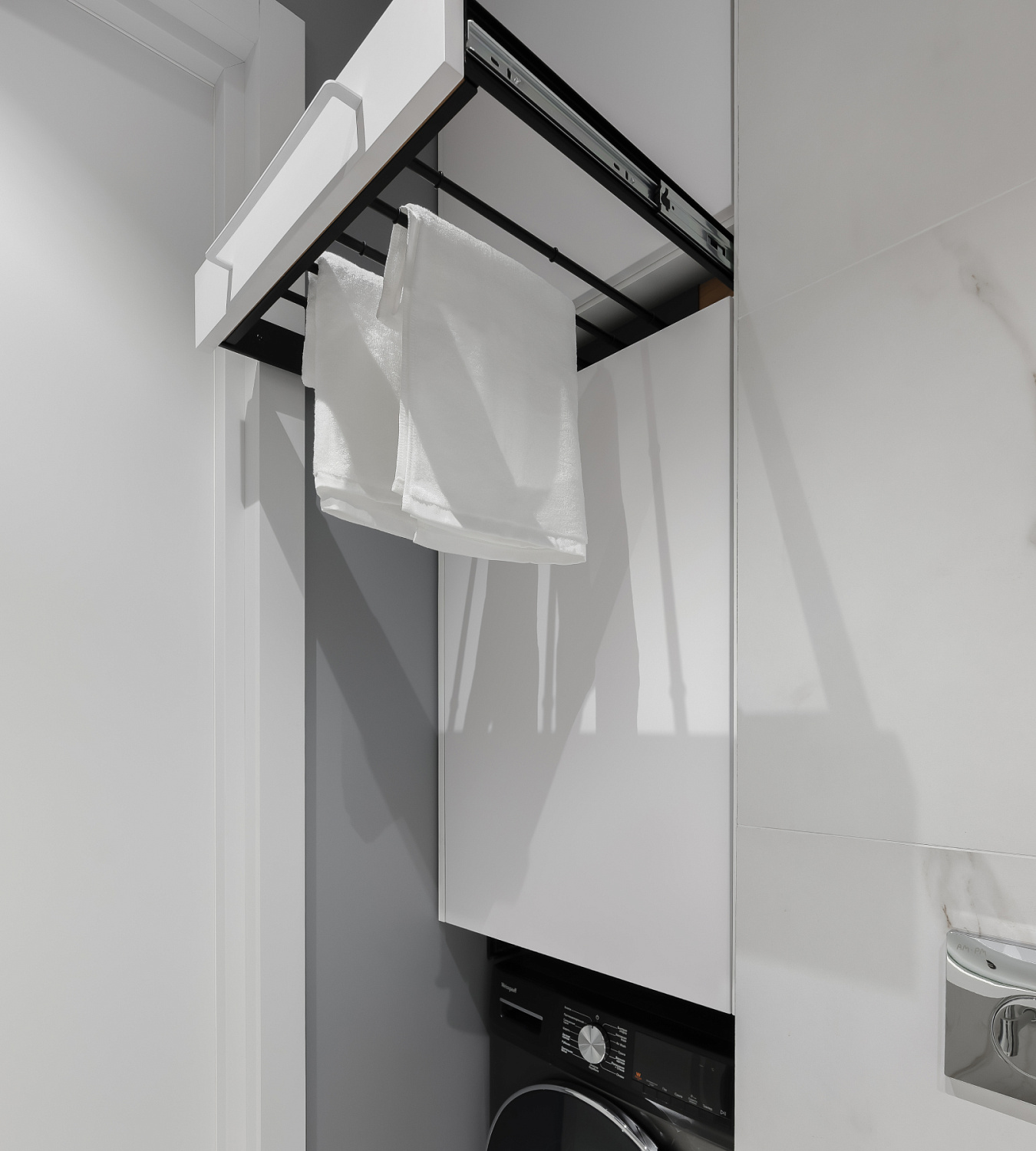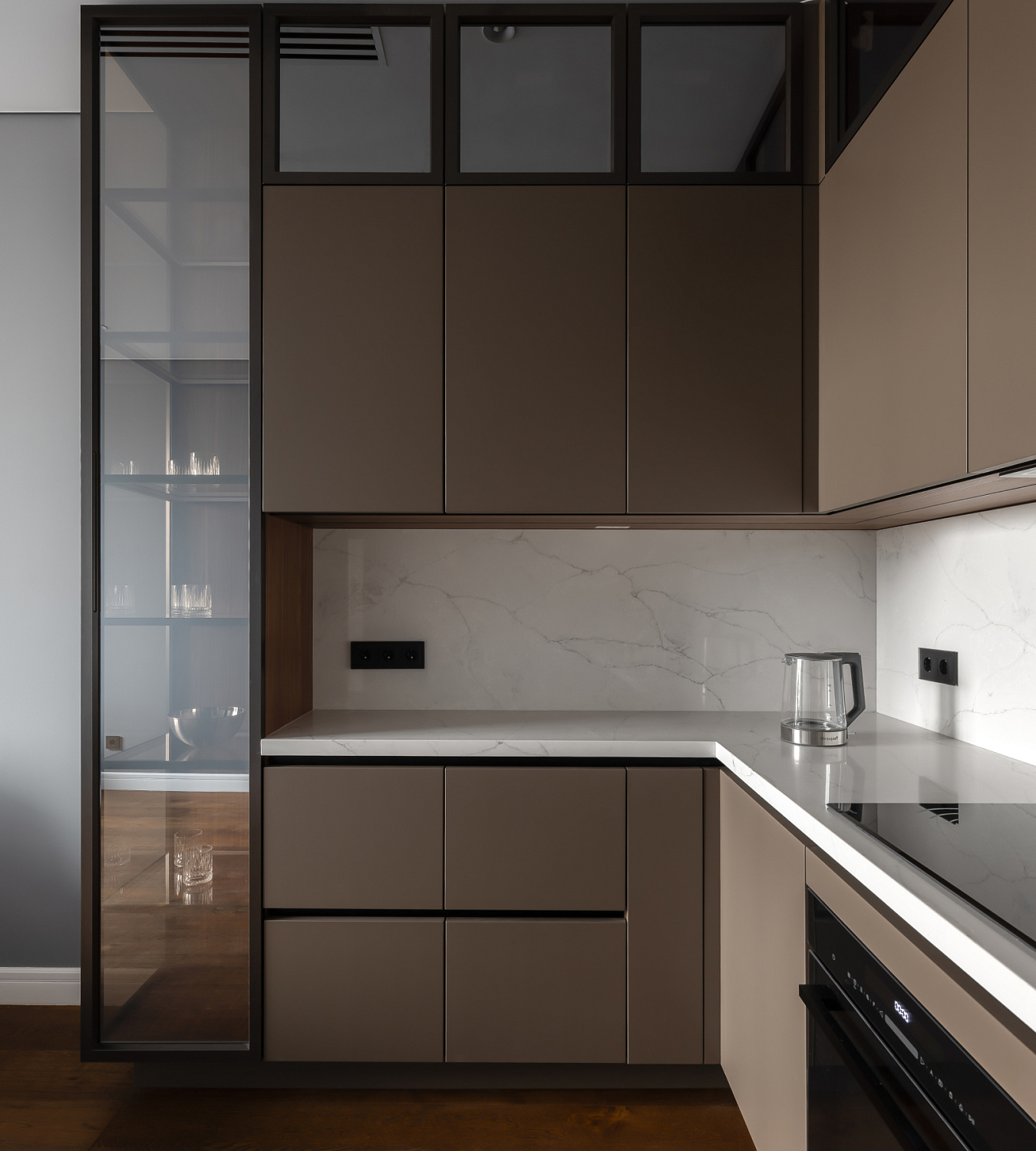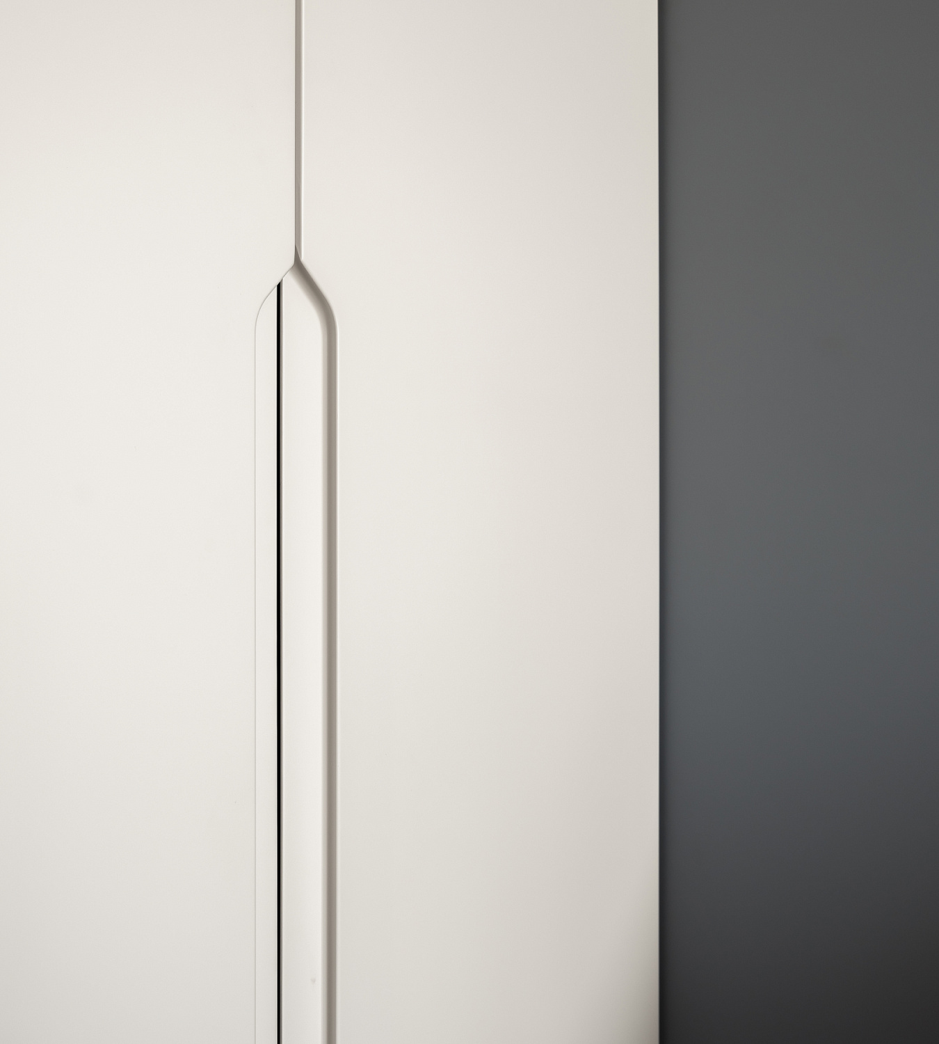 Также в зоне прихожей был реализован шкаф с фасадами в алюминиевой рамке и зеркалами с внешней стороны, оснащённый петлями Neapol с углом открывания 270°. Двери полностью распахиваются, не перекрывая проход и сохраняя комфорт даже в небольшой входной зоне.